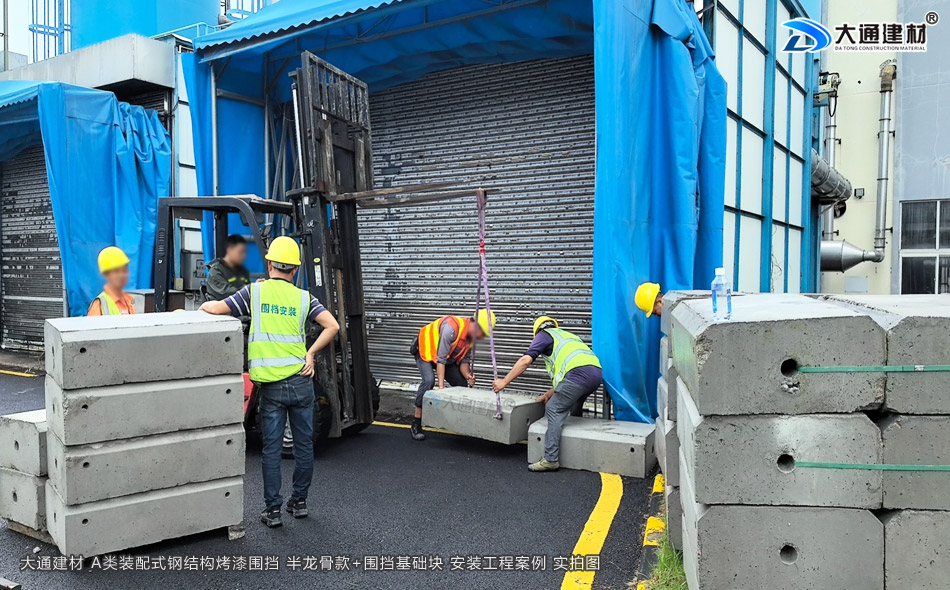 以下展示的圍擋圖片是大通建材把烤漆鋼圍擋A款、圍擋基礎塊送到施工現場后,專業的安裝團隊對產品進行安裝施工環節