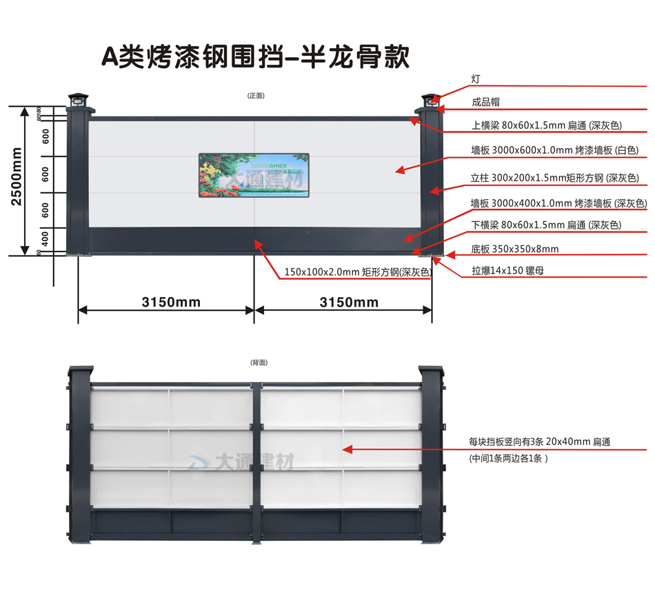 深圳市大通建材有限公司A類烤漆鋼圍擋-半龍骨款廠家直銷,美觀大氣、穩固耐用;適用于深圳圍擋市政建設施工、房地產項目施工、地鐵項目施工、管網改造等工程,為很多項目施工工程提供圍擋批發、圍擋安裝及圍擋廣告業務。