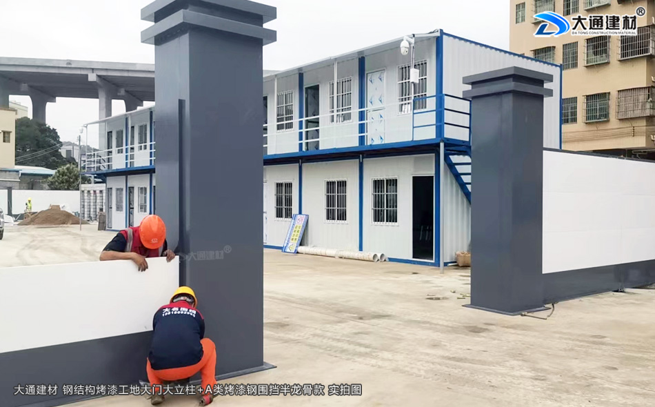 深圳市大通建材的鋼結構烤漆工地大門立柱與A類烤漆鋼圍擋半龍骨款安裝完畢