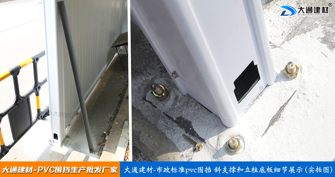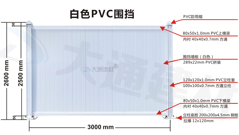 深圳市大通建材生產(chǎn)批發(fā)PVC圍擋符合市政標準,這款圍擋的圍墻板面采用PVC長條版拼接,立柱、橫管均為PVC材料,內(nèi)部均襯方通。立柱底板為鋼板,并加斜撐受力。大通建材常規(guī)款PVC圍擋尺寸長3mx高2.5m、長3mx高2.2m、長3mx高2.0m 其它PVC圍擋尺寸可按實際需要進行定制生產(chǎn)。